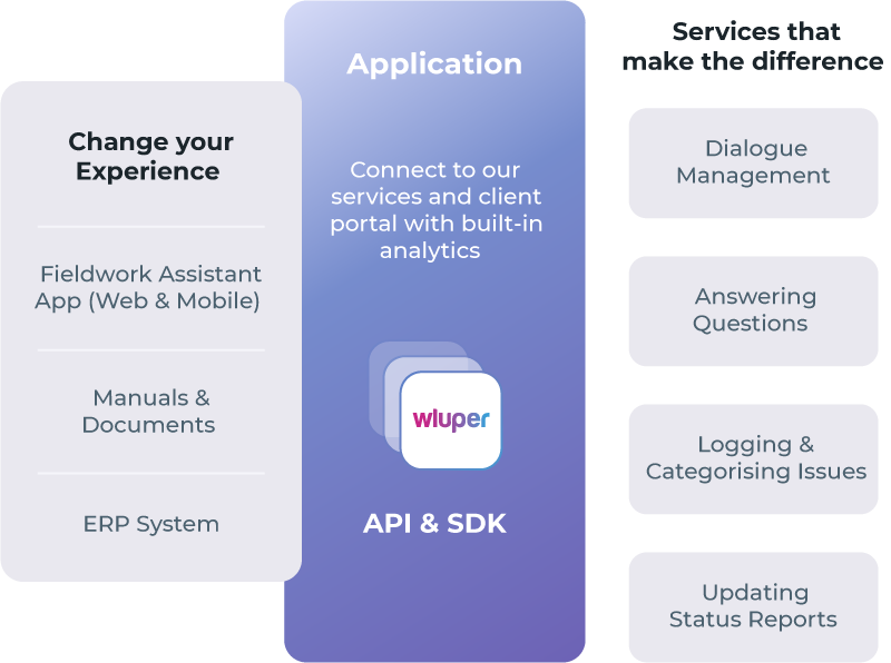 Whether your people are working in the field, inspecting a site or fixing an engine, they all need an assistant - logging their issues, reminding them of important things or answering technical questions. Our dialogue SDK and API gives you access to TrueDialogue®, our state-of-the-art dialogue engine, which is the first of its kind, and allows your workforce to have an experience that is ahead of the competition.